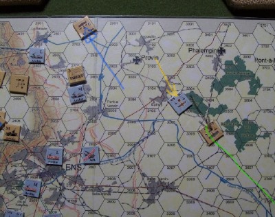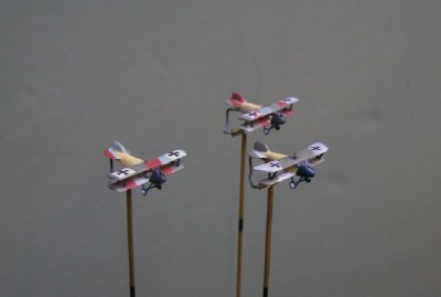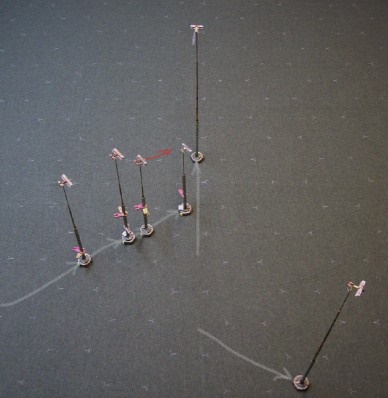 Colin wins the rookie-battle-for-initiative against Bruno and simply moves out/away from the German’s attempts to line up a shot. His luck continues next turn(photo) even with the addition of Gottfreid (whose engine sputters and loses speed) to those hunting him, and he just drives though the whole mess – giving John (his observer) a chance to spot what’s happening. Walter has the opposite luck as the two British pilots he goes up against (Stephen and wingman Christopher) react to his move and take shots at him – no hits, but the German realizes he’s not in a good spot and moves towards his friends. Stephen pursues him, peppering the Albatros with shots, a few of which land, but nothing for Walter to worry about…yet. Christopher has trouble orienting himself and fails to end up within combat range of the others.