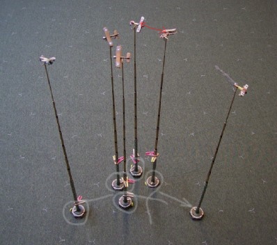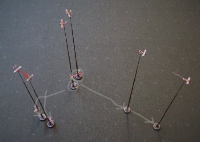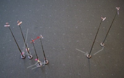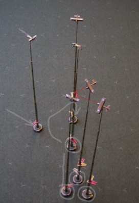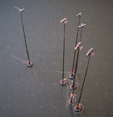 The Germans managed to get to within a mile and a half of the British flight (just as Gerald in the lower ‘craft was setting up his camera for the first exposure) before John – the veteran observer in the back of the formation watching the rear – spotted the Albatros approaching. A little time was spent to get the rest of the team on board (the British models were just moved backwards each turn to represent the decreasing range), and then Flight Leader Stephen wheeled the top Sopwiths around to face the foe while the photo machine kept on to do the work of the mission. The snow lightened a bit, and both groups climbed to the cloud base. Everyone also pushed their throttles forward, but not all were rewarded by the expected increase in power/speed. John’s pilot -the rookie Colin- couldn’t quite make the doings work to make the rotary engine work up to specs, but he hasn’t fallen out of formation…yet? On the German side, Gottfreid has found that his Mercedes is not cooperating at all – even going so far as to start issuing smoke instead of power. He falls behind (and isn’t able to climb with Walter and Bruno) but pushes on – his sense of duty/camaraderie overriding the common sense path of turning for home.