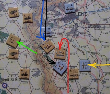Jasta 11 soon spotted 43 Squadron, but as they came behind Jasta 30 (which had turned / climbed to face the Strutters) they saw the Triplanes (which had noticed the arrival of the new group of Albatros) moving in and so have turned their attention to dealing with the climbing RNAS group. The board will now be reset to 600′ hexes (and the pretty colors will be shelved – back to good old grey lines).