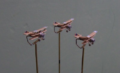 The day’s first encounter looked to be between B Flight of 8 Naval (3x Sopwith Triplanes) and Jasta 30 (4x Albatros DIII and 1x DII), but after the minis were on the table things fizzled out. The Germans had taken off from Phalempin and were climbing to the west when they spotted (and were spotted by) the British who were around 2-1/12 miles to the south on the northwest leg of their offensive patrol. The Tripes were cruising at 11,000′ and the Albatros formation was just climbing through 10,500′ – so the British had a speed and height advantage at the start, though being outnumbered (almost 2:1 in planes and more than 3:1 in guns) probably more than offsets that. It would have been nice for them if 43 Squadron‘s line patrol had noticed them and joined the fight, but such was not to be and the Strutters turned south.