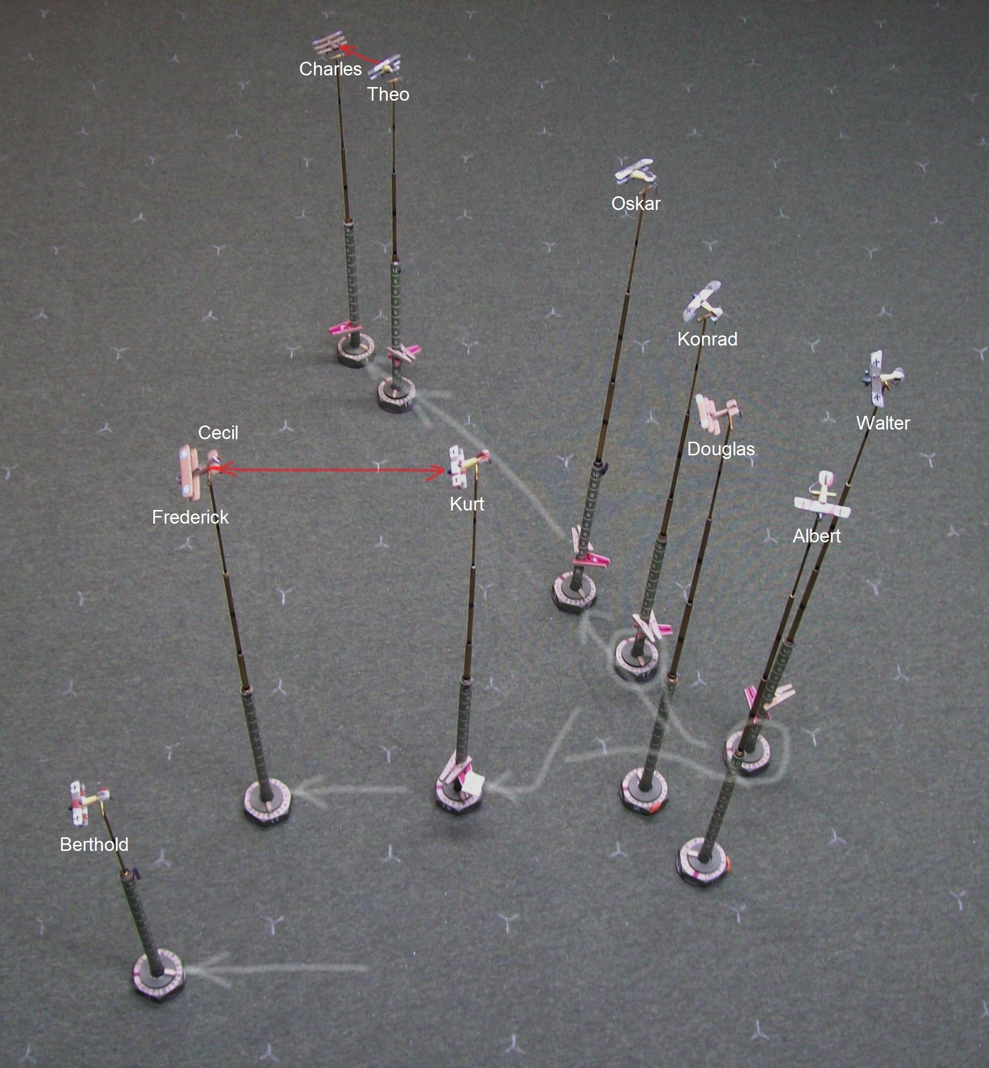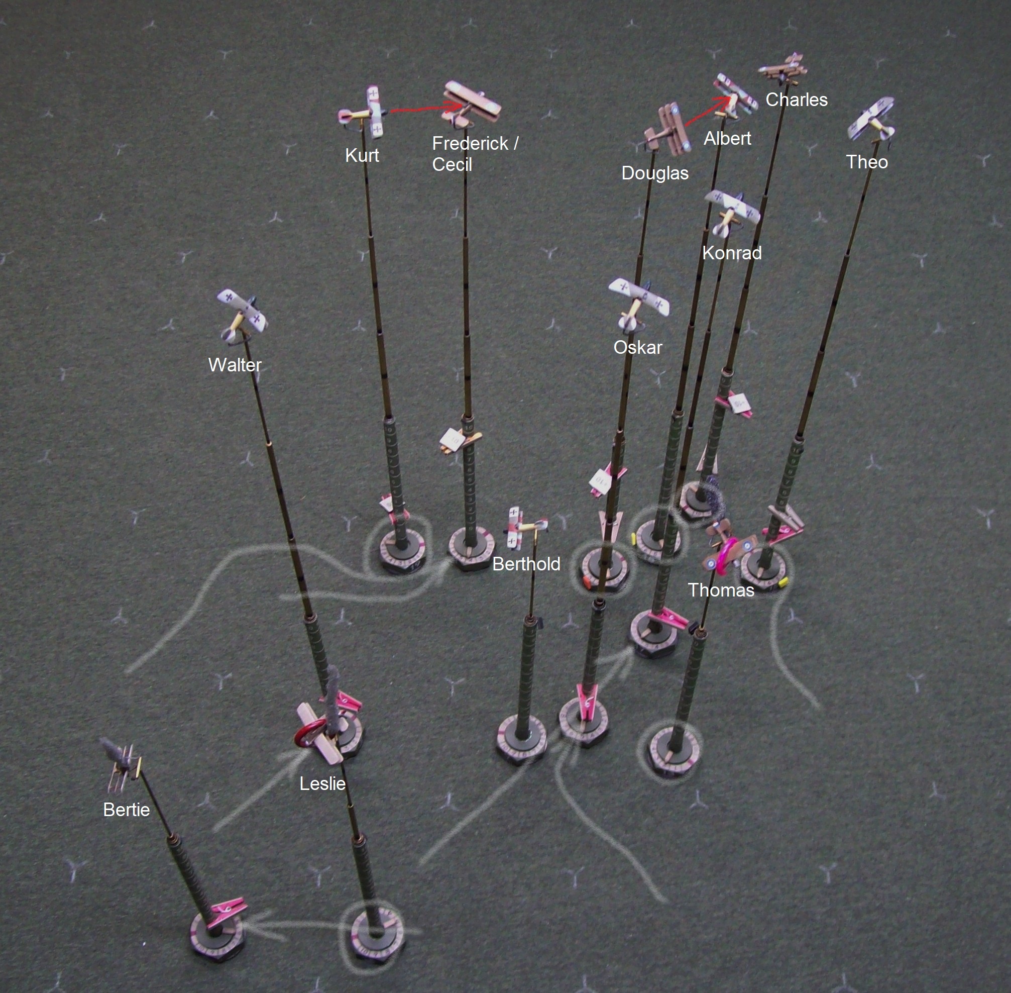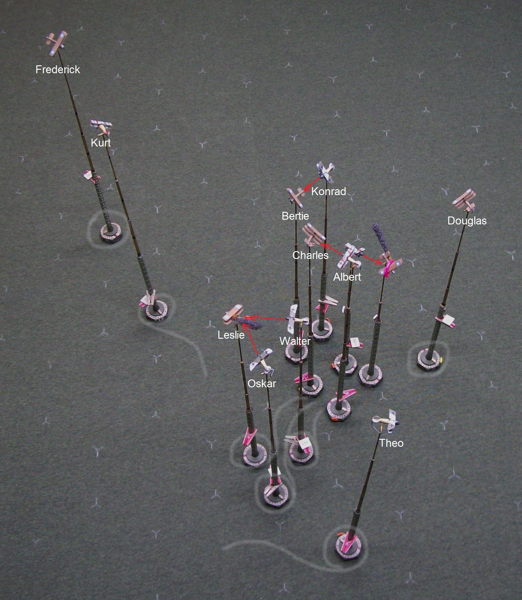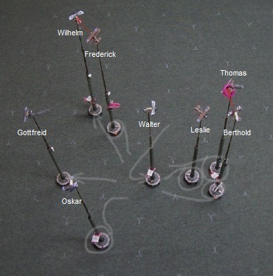 Walter and Leslie continue to dance around each other and Reggie pops away at the German as opportunity arises – the damage done so far isn’t critical but has passed the point of being merely annoying and Walter knows that continuation of the fight on these terms isn’t going to lead to anything good. Oskar has circled in and is now in a position to engage Leslie and tip things in the Hun’s favor but the diving Triplanes may ensure that the balance of power remains with the British. Of the three Tripes, rookie Albert can’t make any sense of the chaos in front of him, but Charles and Douglas perch above Oskar and Walter, respectively, ready to pounce upon the unsuspecting Germans. Everything isn’t going the Brit’s way, however: Poor Thomas fails to get any power from his damaged engine and can do nothing to avoid the persistent fire from Berthold that brings the Strutter’s classification as an aircraft capable of controlled flight into serious doubt while Edgar, its observer, is still out of the fight, having yet to get himself sorted after the spin.