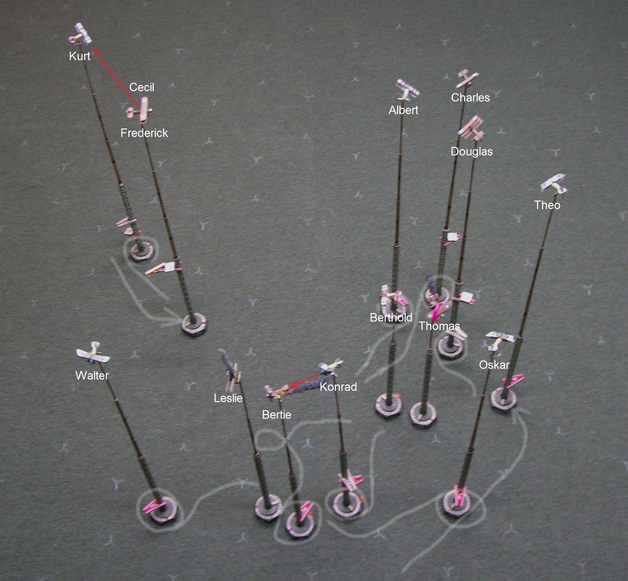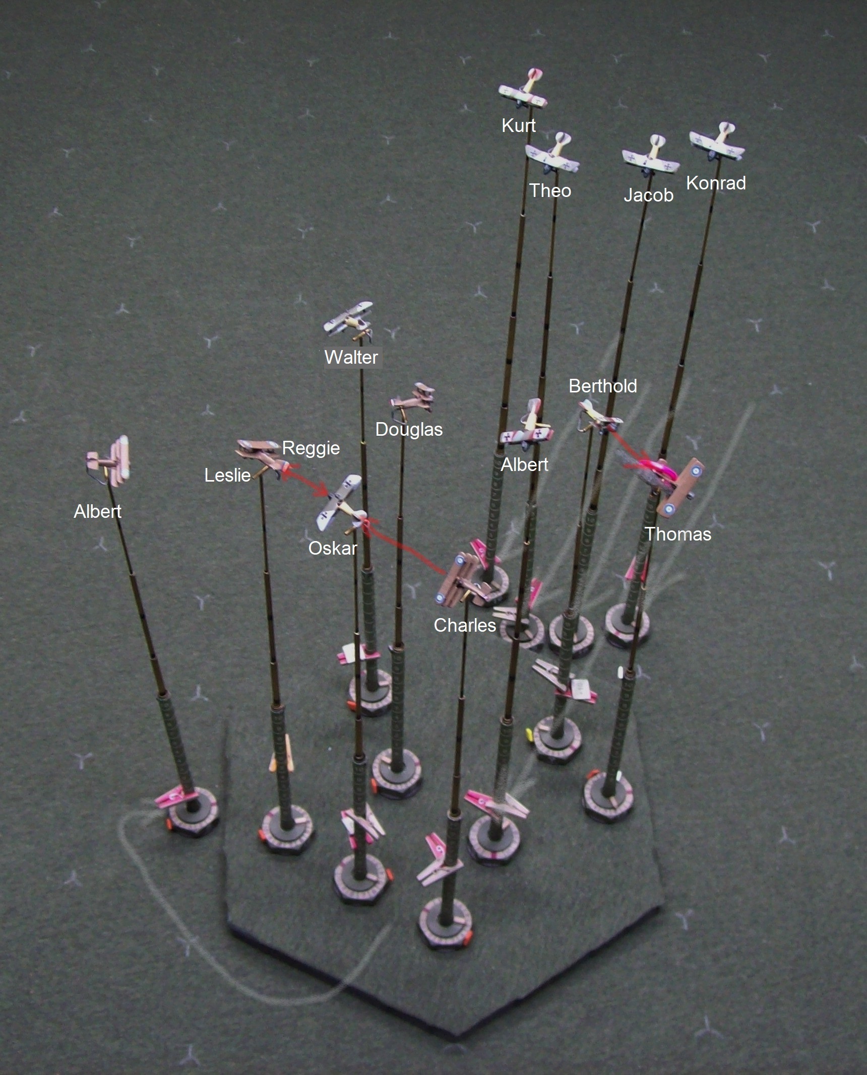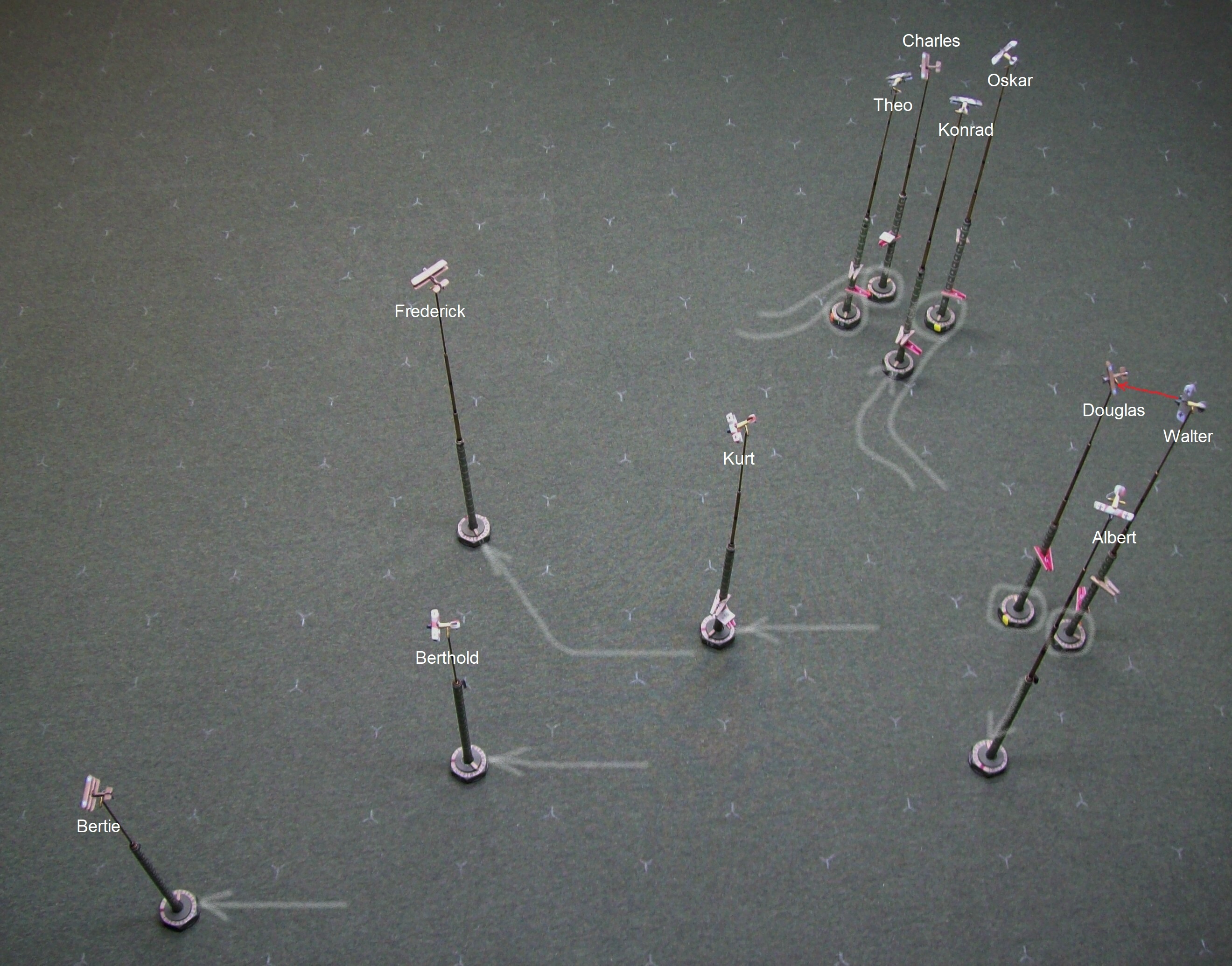 Walter and Leslie continue to dance around each other and Reggie pops away at the German as opportunity arises – the damage done so far isn’t critical but has passed the point of being merely annoying and Walter knows that continuation of the fight on these terms isn’t going to lead to anything good. Oskar has circled in and is now in a position to engage Leslie and tip things in the Hun’s favor but the diving Triplanes may ensure that the balance of power remains with the British. Of the three Tripes, rookie Albert can’t make any sense of the chaos in front of him, but Charles and Douglas perch above Oskar and Walter, respectively, ready to pounce upon the unsuspecting Germans. Everything isn’t going the Brit’s way, however: Poor Thomas fails to get any power from his damaged engine and can do nothing to avoid the persistent fire from Berthold that brings the Strutter’s classification as an aircraft capable of controlled flight into serious doubt while Edgar, its observer, is still out of the fight, having yet to get himself sorted after the spin.