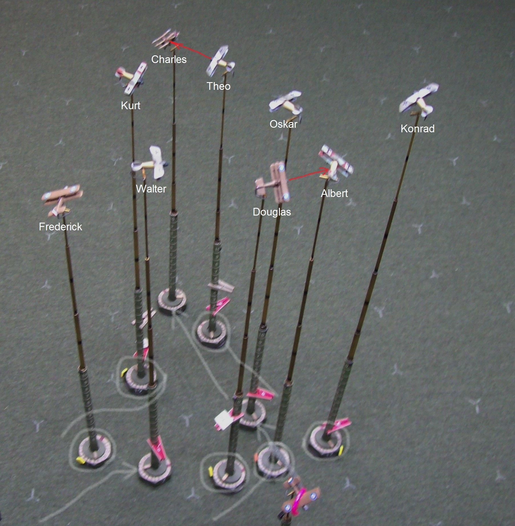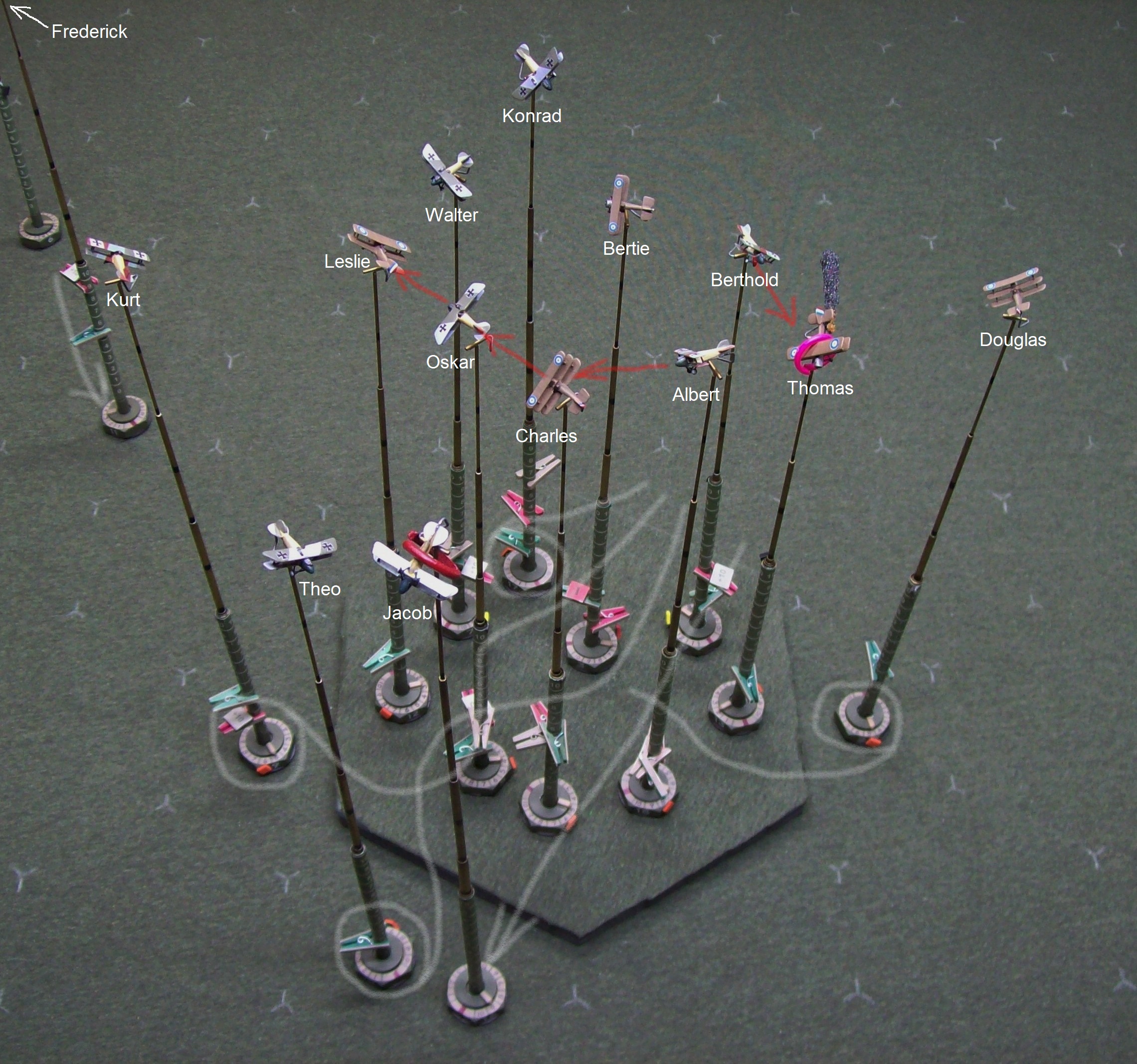 Wilhelm’s day goes from bad to worse (in the upper-left of the photo) as his attempts to escape danger are hampered by his wounds and lack of speed/power. His efforts lead only to him stalling in front of Frederick who pours continuous fire into the stricken Albatros and ‘worse’ becomes ‘worst’ as flames begin to lick along the sides. Wilhelm’s only hope now is to join Gottfreid in a glide to a safe crash landing but such is a slim chance to (literally) bet one’s life on. Jasta 11 is still well out of range and the design quirk of the newer Albatros’ single-spar lower wing is causing trouble in the speedy dive as Jacob in the DIII on leader Theo’s left feels a shudder and notices the fabric rippling in a decidedly disconcerting manner. Ahead, the 8 Naval Triplanes dive into the fray (and the big hexboard is back…)