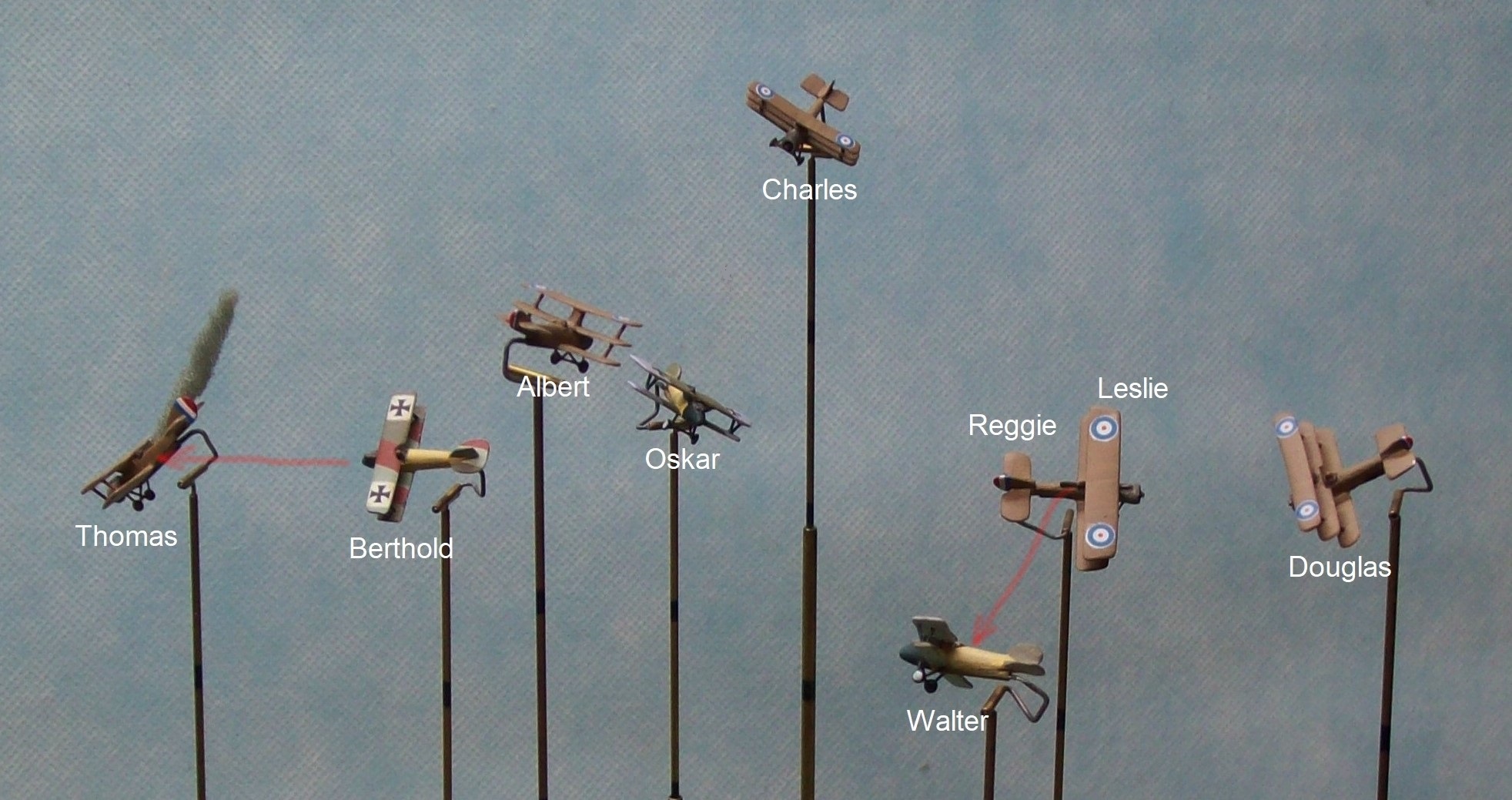 The cluster of aircraft separates and Walter ends up alone in the previously crowded airspace – he’s set his sights on Leslie who tries to find his bearings after a near collision with Thomas. Oskar ends up by himself as does Gottfreid who dives away to (hopefully) nurse his wounded plane back to base. Others wish they were alone: Thomas compounded his smoking engine troubles with a spin resulting from frantic maneuvering to avoid the collision with Leslie and still has Berthold peppering him with bullets. Wilhelm is also in trouble as his attempt to climb away has not given Frederick the slip and he is badly wounded.