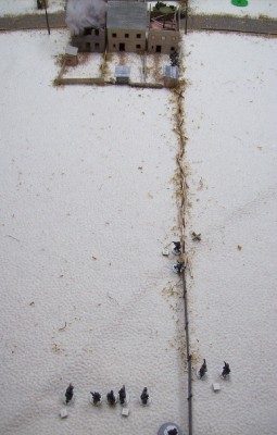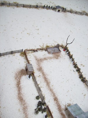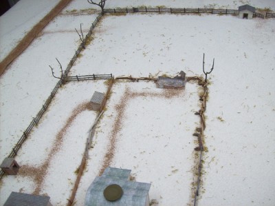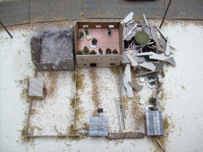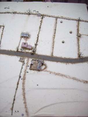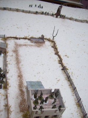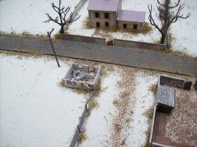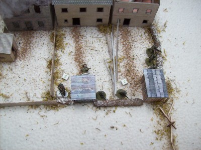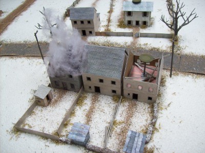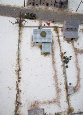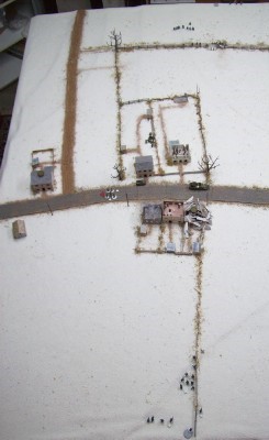 16 December, 1000 hrs. The Germans attack the outskirts of town from two sides: The 3rd Company will renew its assault from the valley in the south while the 1st Company swings around the hill to the north. The request for an artillery barrage to soften up the defenders has been granted, and manages to hit the row houses on the SW side of town hard (center photo below), setting the western building on fire while collapsing the roof of the eastern one. A shed on the NW corner as well as the small house next to the smithy have also been destroyed.