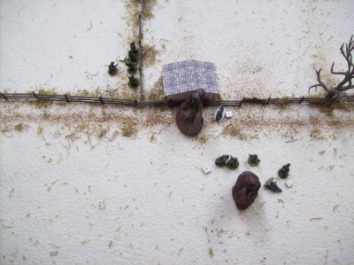 (Note: To represent crossing the open ground while moving around the hill, units of the sturm platoon deploying on the right were first placed lying down, were stood up on their next activation, could then advance on the table on their third activation, and would be subject to fire throughout the process.)