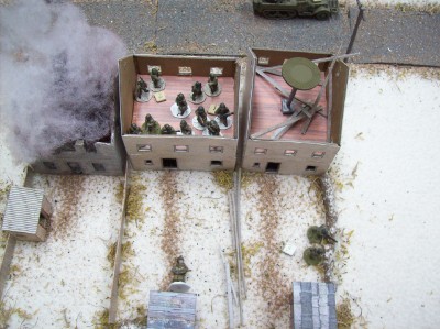 Two of the MG crew were taken out by the falling rubble, and the shock on the remaining rifleman was enough to send them running for the rear, leaving the remains of the squad in the center house to defend south of the road.