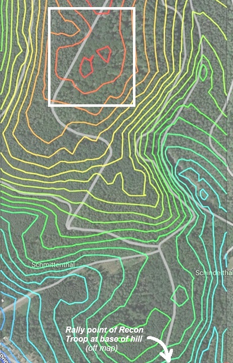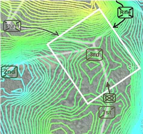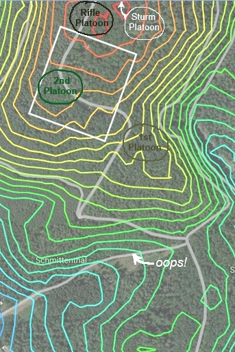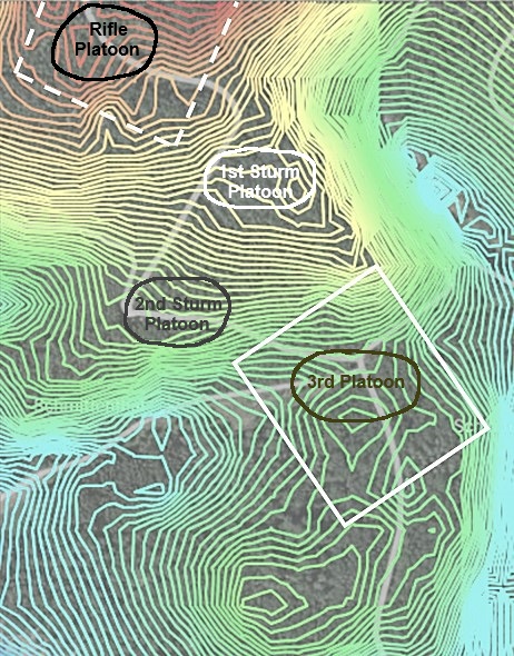 It will join the Sturm Platoon (overseen by the Company CO) in attacking down the track again while the Rifle Platoon is sent back up and around to the other (eastern) flank of the hill…