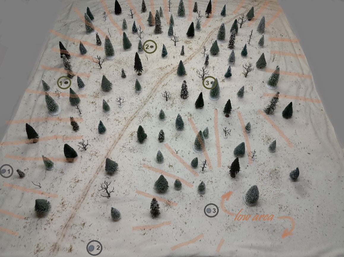 Both sides put central JOPs on the ridge/hill. The Germans placed one over on their left side which the Americans countered with one of their own. The final U.S. JOP was put overlooking the ‘pit’ where the attackers had put their last JOP.
